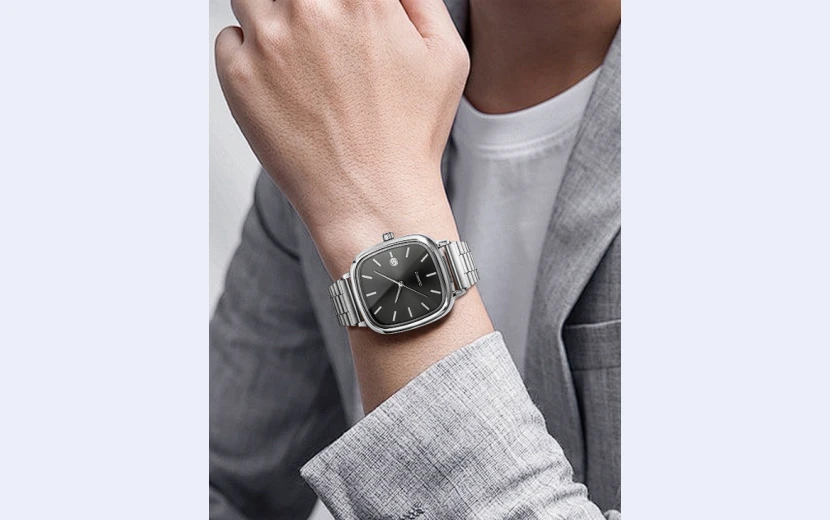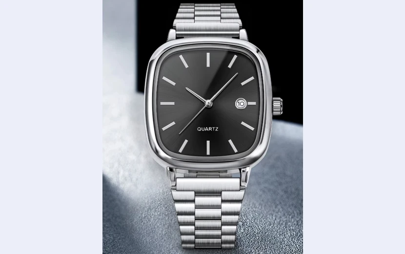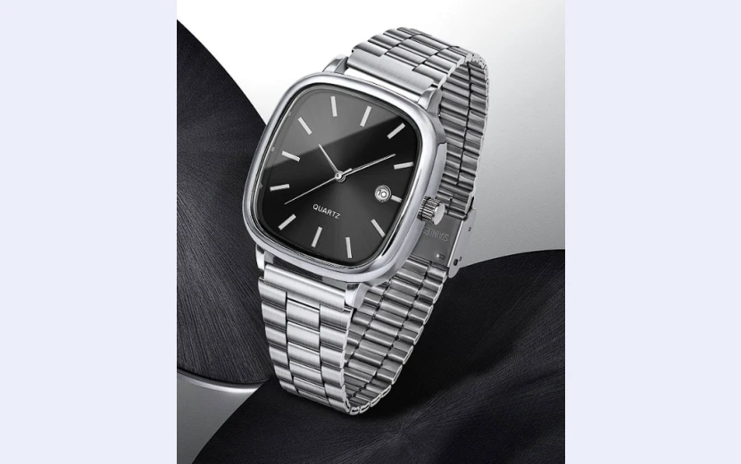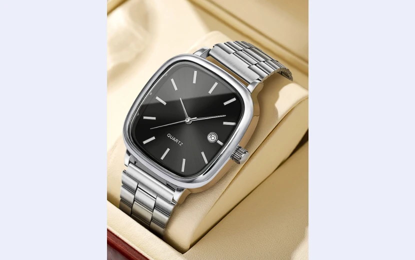 A modern men’s fashion watch featuring a 35 mm square dial, stainless-steel band, and precise quartz movement. Designed with a clean pointer display, auto-date function, and glass dial window, it offers both style and reliability. Lightweight, comfortable, and 10 m water-resistant, this minimalist yet luxurious timepiece is perfect for daily, casual, and smart wear.